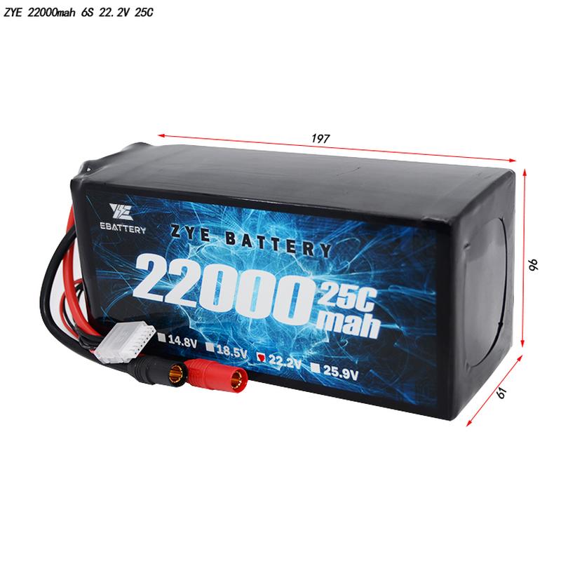 | 22000mah | 6s 25.2V | 22.2v | 488Wh | 200 * 91 * 63 | 2.54kg | 264A (12C) | 550a (25c) |
